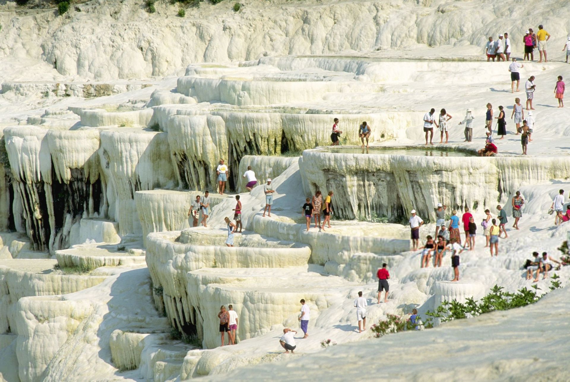 Pamukkale, meaning “cotton castle” in Turkish, is a natural site in Denizli Province in southwestern Turkey. The area is famous for a carbonate mineral left by the flowing of thermal spring water. It is located in Turkey’s Inner Aegean region, in river Menderes valley, which has a temperate climate for most of the year. The ancient Greek city of Hierapolis was built on top of the travertine formation. Pamukkale city was added as a UNESCO World Heritage Site in 1988 along with Hierapolis.